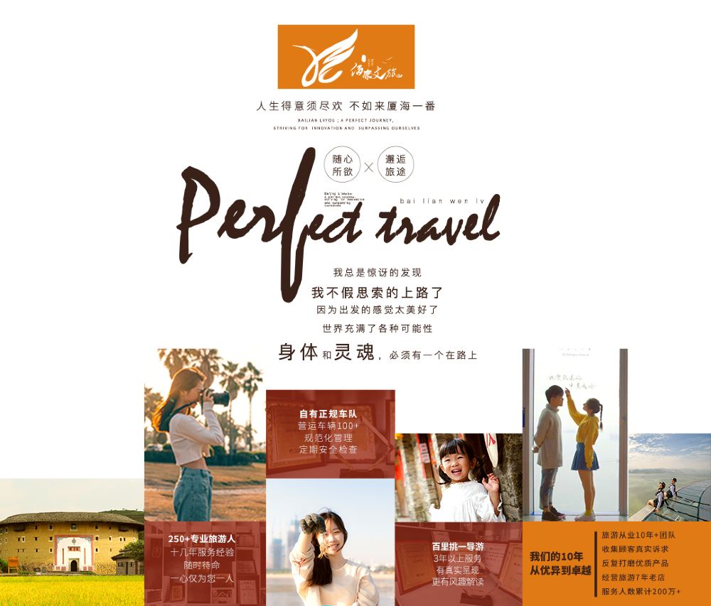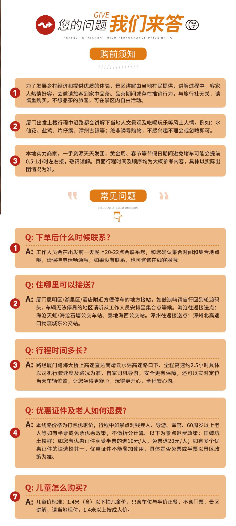 1、本线路页面行程时间及顺序均为大概参考内容,以实际出团情况为准,工作人员提前1天晚上22点前会联系您(请以实际通知为准,保持电话或短信畅通,以免耽误行程) 厦门思明区/湖里区/酒店附近方便停车的地方接站,如鼓浪屿请自行回到轮渡码头,车辆无法停靠的地区请听从工作人员安排至集合点等候。海沧往返接送点:海沧天虹/海沧石塘公交车站、泰地海西公交站。漳州往返接送点:漳州北高速口物流城东公交站。