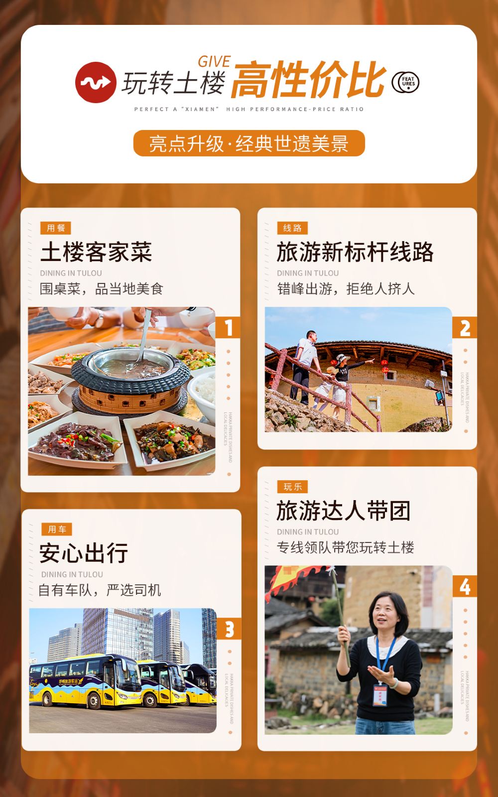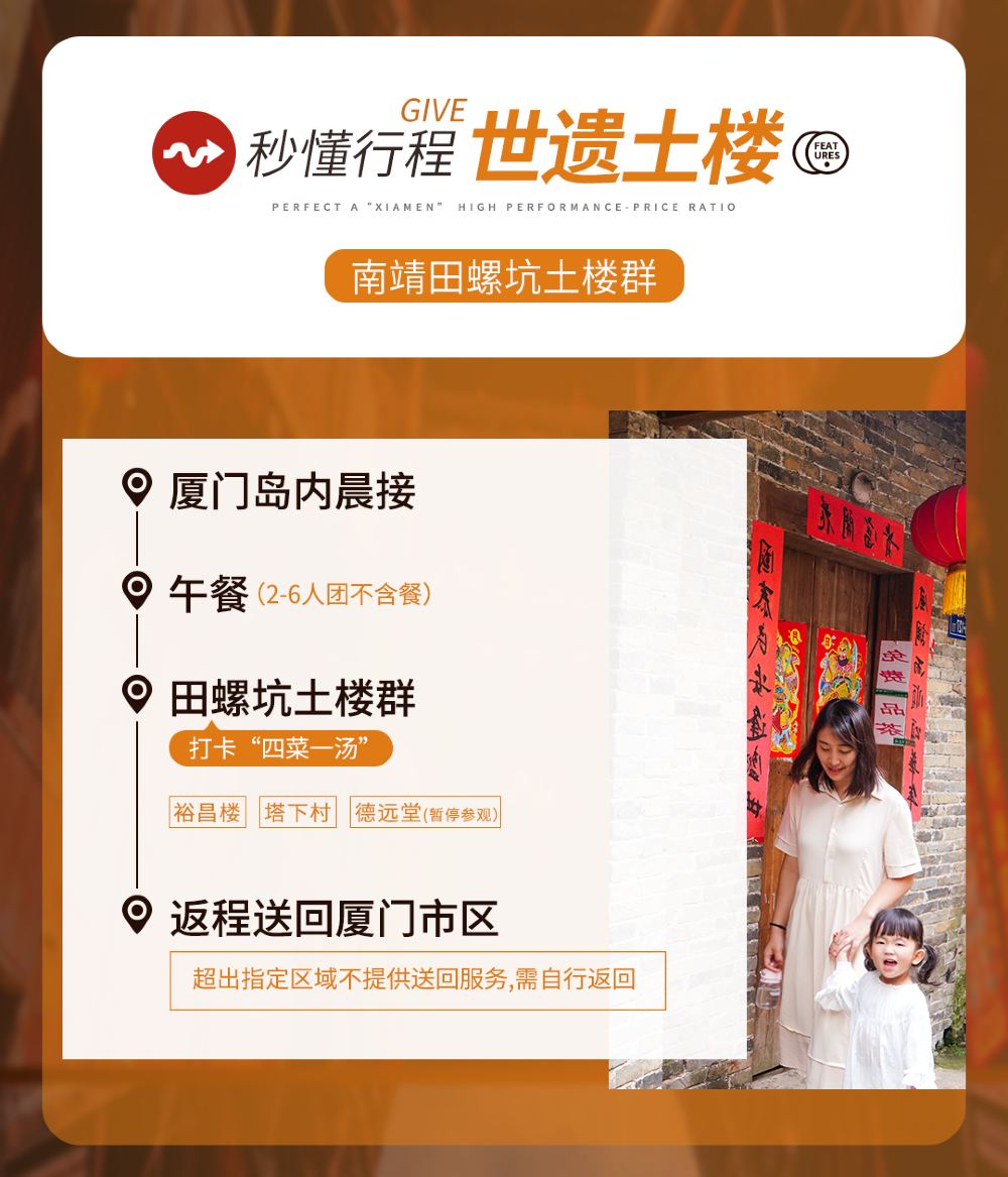 所有土楼线路法定节假日(包括元旦、春节、清明节、劳动节、端午节、中秋节、国庆节)等特殊日期一经预订成功不可退改,由于接待量比较大景区会出现拥堵情况需耐心等待,无费用赔偿。部分出游车上可能会出现没有工作人员,只含当地景区讲解。18人小团人数无上限,可能会出现单双线拼车的情况。
