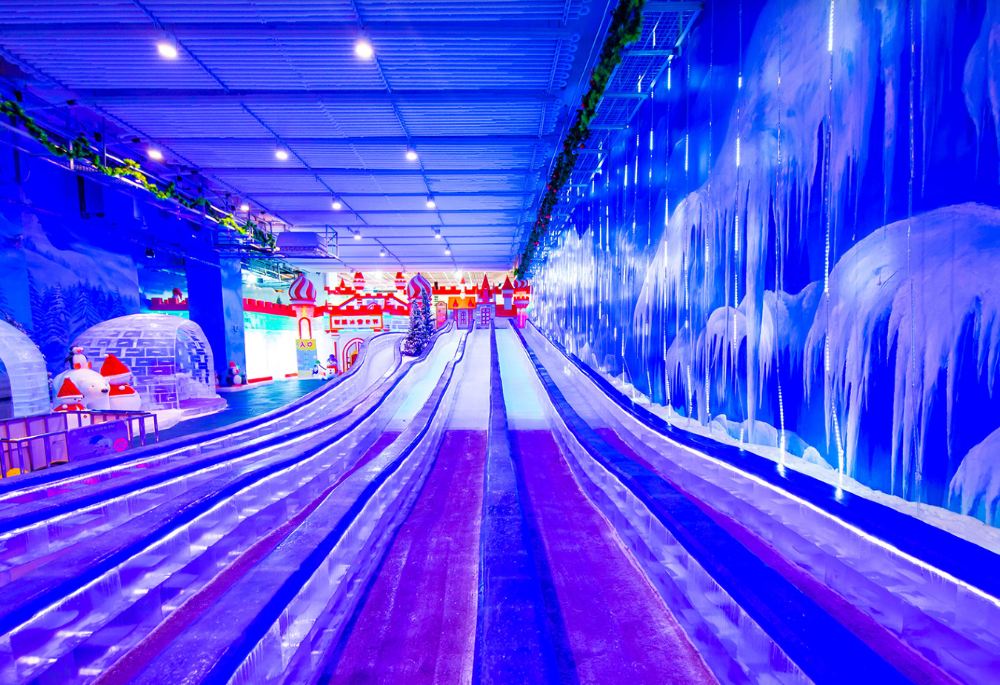 这里是被白色女王施了魔法的翡翠谷娱雪区,它变成了常年冰封飘雪的白色世界,寒冷但洋溢着浪漫唯美的气息。这里设有两条雪滑道与七条冰滑道,还有各类特色冰雕展,在这里游客们一年四季都能玩雪,嬉雪。
