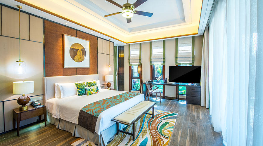酒店别墅区均为独栋别墅,别墅大床套房由独栋别墅拆分而来,绚丽的色彩,带有复古味道的吊扇,意境深远的挂画,颇有质感的墙面和地板……还有更多考究的细节,足见酒店匠心。
