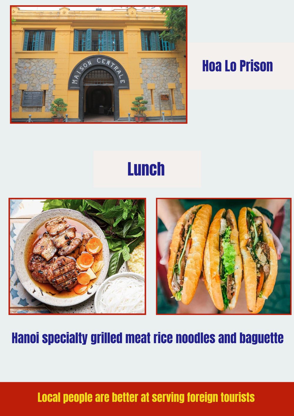 上午 11:30 之前,您将到达火车街,准备拍摄返回河内火车站的火车照片/视频。这是旅程中令人期待的部分。之后,这里享用午餐,品尝河内特色的法棍和烤肉米线。