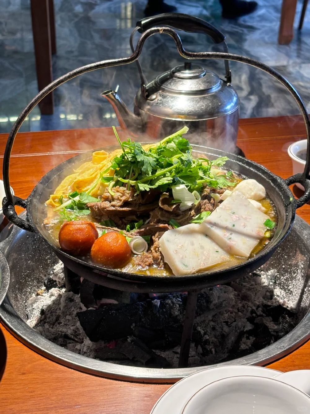 ▲ 中餐享用罗田县 “十大名吃”吃吊锅,要从上往下一层层地吃,先吃外面容易熟的豆制品,再吃荤菜,然后吃干货。