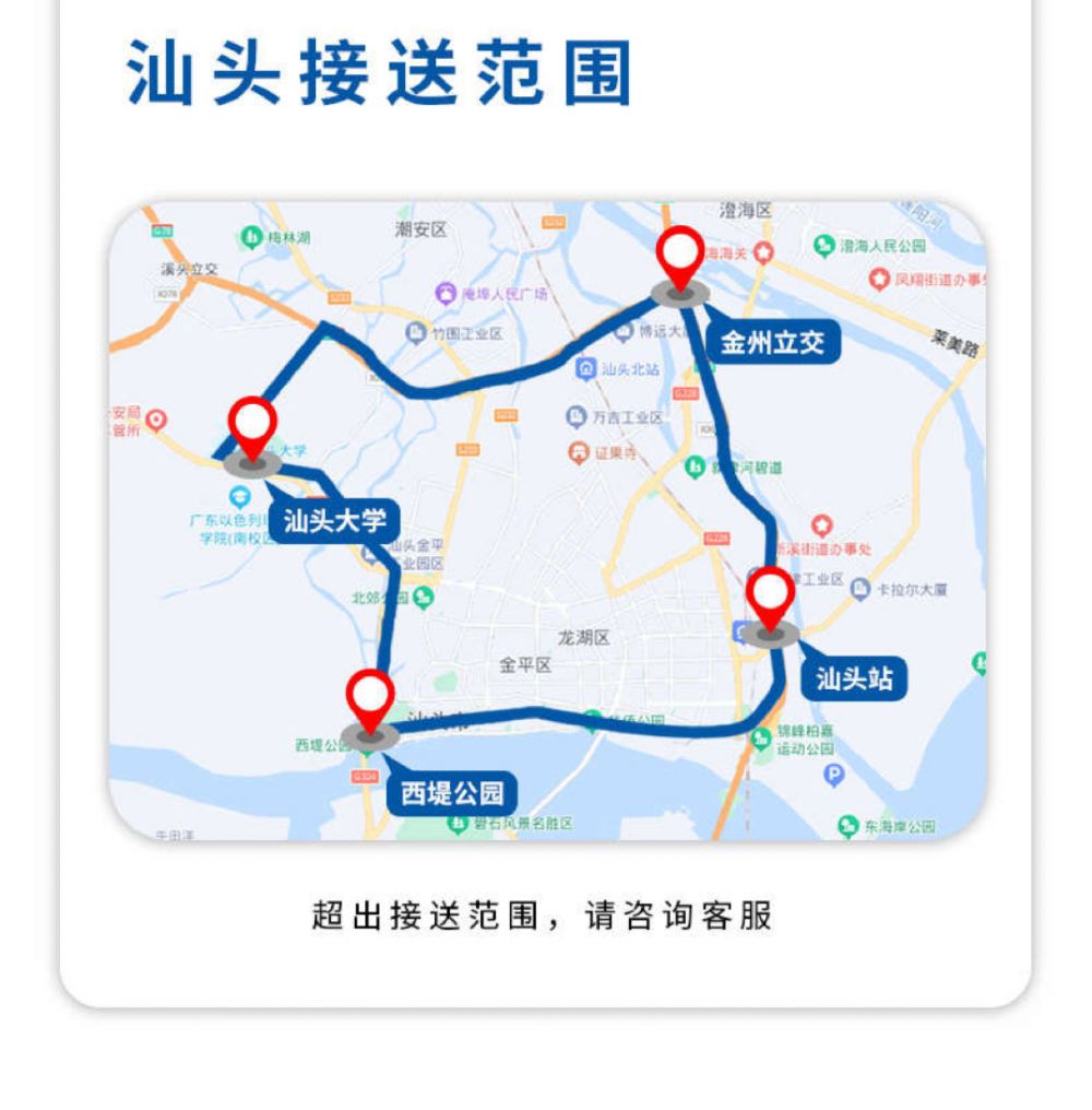 ▲ 1、接送点:汕头市区(包括金平区、龙湖区、汕头站); 另外不同城市或者区域接送需要咨询客服是否补差价,汕头南站,潮汕站;揭阳机场;濠江区;潮阳区;澄海它异地上下车联系客服补差价 2、时间范围内,除了您自己吃饭、涉及少量景点门票(不去也可以) 3、用时:【汕头当天接送10小时以内】【汕头接结束送潮州9小时以内】,5座或者7座超1小时补师傅加班超时50元/小时,9座以上或者商务7座超一小时补师傅加班费80