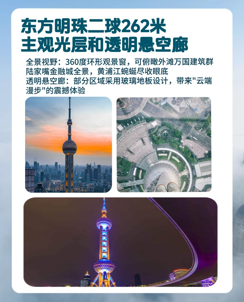 ▲ 259 米全透明悬空观光廊:150 米长的强化玻璃走道,地面与立面均为透明设计,站上去如同悬浮于高空,脚下是车水马龙的陆家嘴街道与流淌的黄浦江。玻璃可呈莲花状开合,是体验 “云端漫步”、拍摄震撼悬空大片的必到之处。