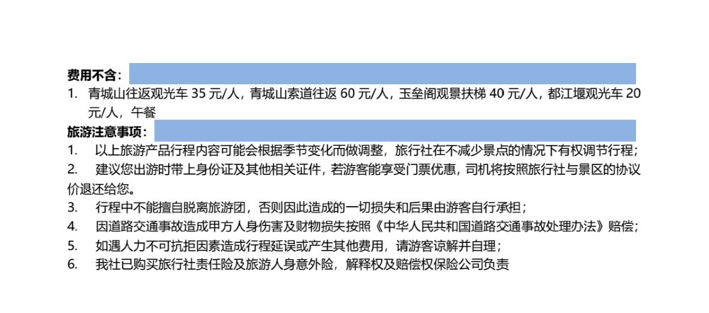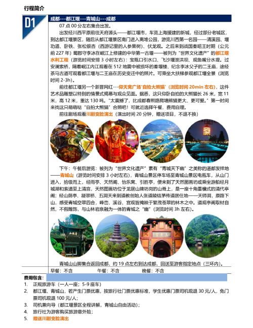 景区内不含:青城山往返观光车35元/人、青城山往返索道60元/人;都江堰观光车20元/人,玉垒阁扶梯40元/人,餐食自理。