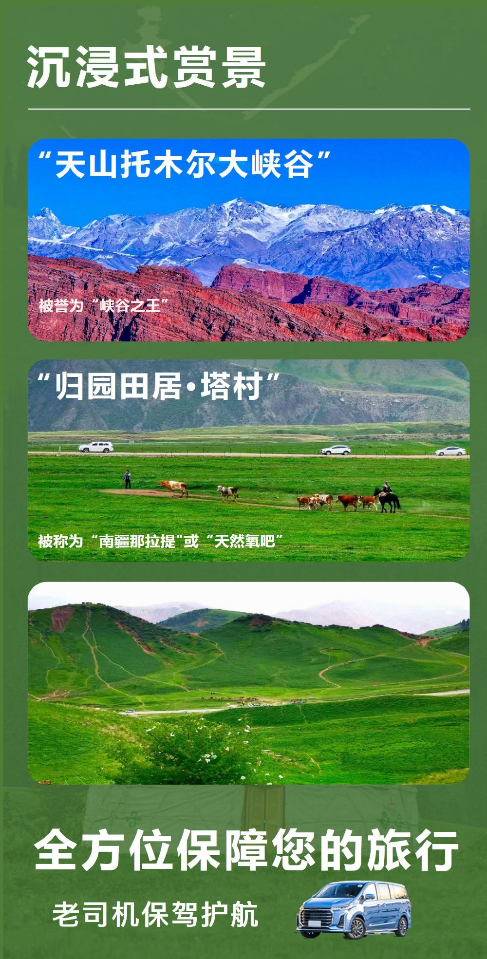 4、天山托木尔大峡谷景区对区间车运营线路进行优化调整,现设有两条区间车线路。其一为景区常规线路,区间车价60元/人,该线路行程已包含在团队旅游套餐内,但不包含世界盐谷游览点;其二为全新开通的世界盐谷专线,票价20元/人。如您有游览世界盐谷的需求,可自愿选择乘坐此专线,相关费用需自理。