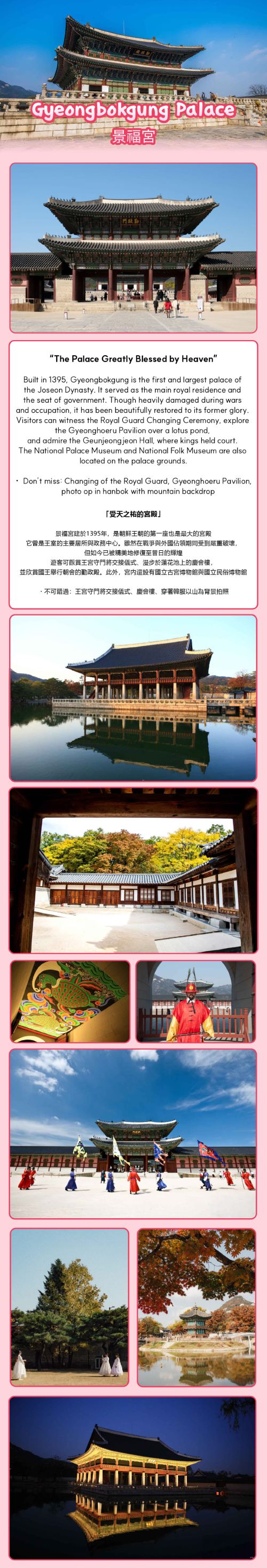 ▲ "受天福佑的宫殿" 景福宫建于1395年,是朝鲜王朝第一座也是规模*大的宫殿。这里曾是王室的主要居所和政府中枢。 尽管在战争和占领期间遭受严重损毁,如今它已华丽复原,重现昔日辉煌。 游客可观赏守门将换岗仪式,探访莲花池上的庆会楼,并欣赏国王举行朝会的勤政殿。 国立故宫博物馆和国立民俗博物馆也坐落于宫殿区域内。 何不跟随我们的专业导游,一同探索景福宫背后的深层故事?