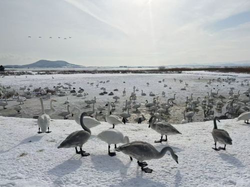 ▲ 每年冬天,成群的天鹅如约而至,荣成天鹅湖便成了一 片梦幻的童话世界。冬日的阳光洒在天鹅洁白的羽毛 上,优雅的身影划过水面,像一幅正在流动的水彩画。 站在湖边,听天鹅低鸣,与湖水拍岸的声音交织在一 起,仿佛是冬天专属的协奏曲。