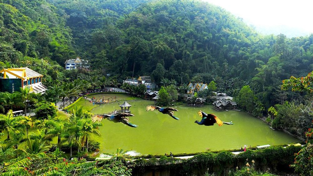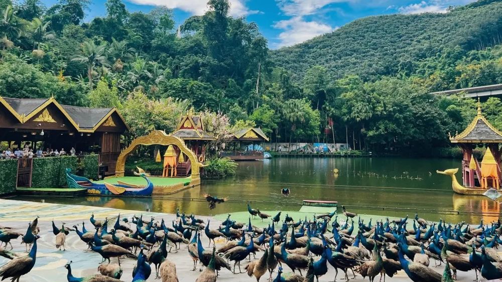 ▲ 孔雀放飞,赴一场浪漫之约 让人期待的,当属孔雀放飞!随着哨声响起,上百只孔雀从对岸的山林翩然起飞,在湖面上空划过一道美丽的弧线,优雅地落在岸边。那一刻,眼前的景象美得令人窒息,仿佛时间都停止了。