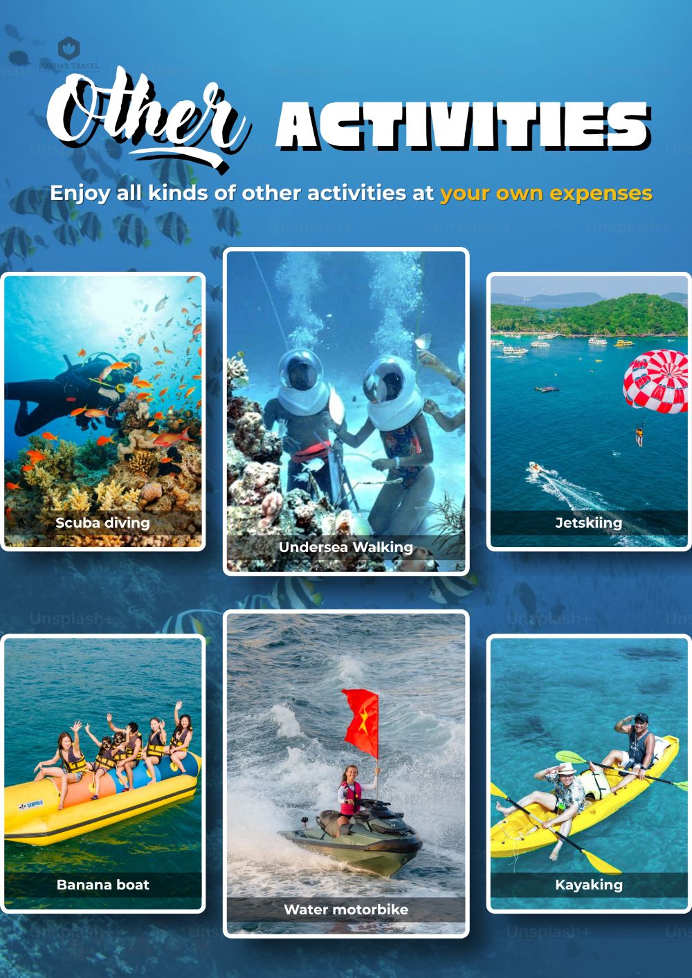 对于寻求冒险的人来说,这里还有一些可选的水上运动供您体验,例如水肺潜水、水下漫步、香蕉船、皮划艇……