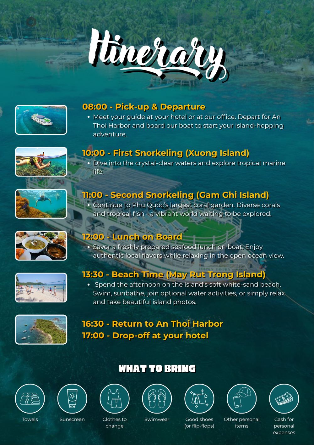 - 08:00 - 接送及出发:请在您位于富国岛阳东坊的酒店或我们的办公室与导游会面。如果您住在阳东坊以外的地区,请与我们联系。之后前往安泰港,登上大船,开始您的跳岛游之旅。