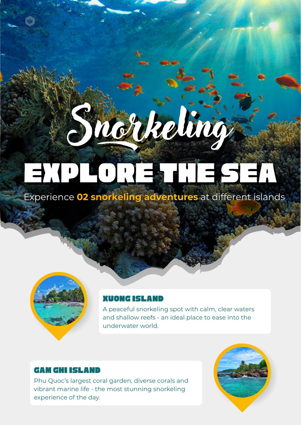 ▲ 在两个不同的岛屿上进行两次浮潜,探索海洋,其中包括富国岛*大的珊瑚王国。尽情享受**的水下世界。