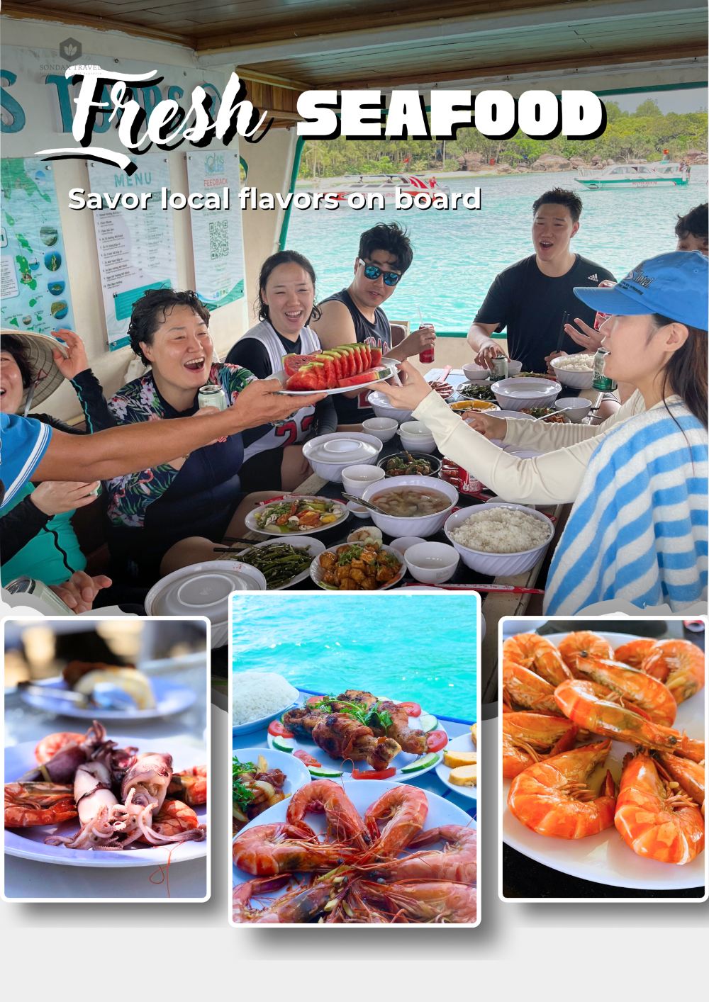 ▲ 在船上享用美味的海鲜午餐——地道的当地风味,带您真**尝富国岛的美味。