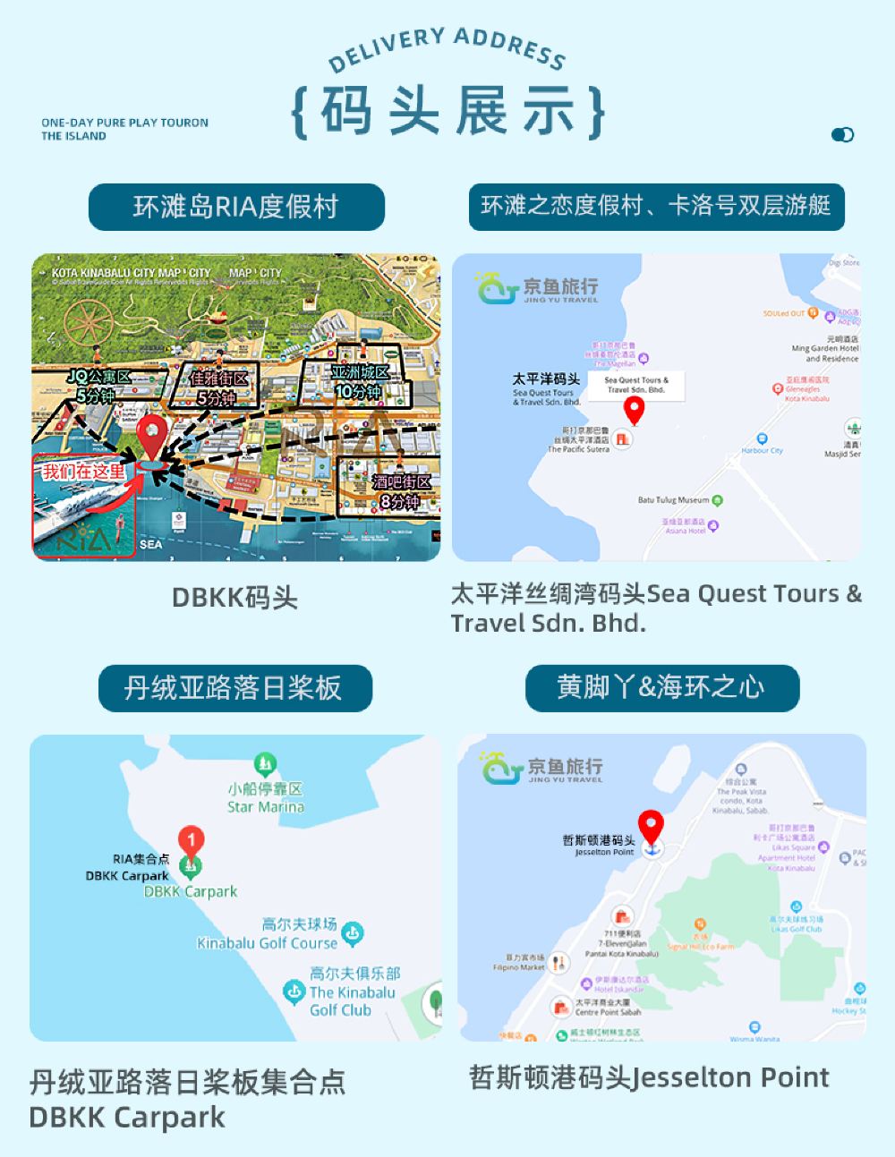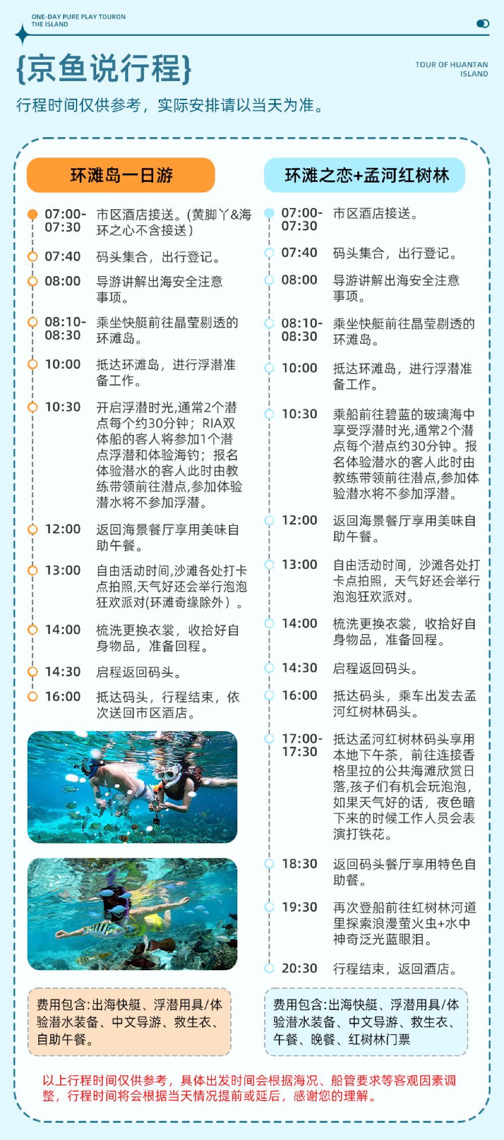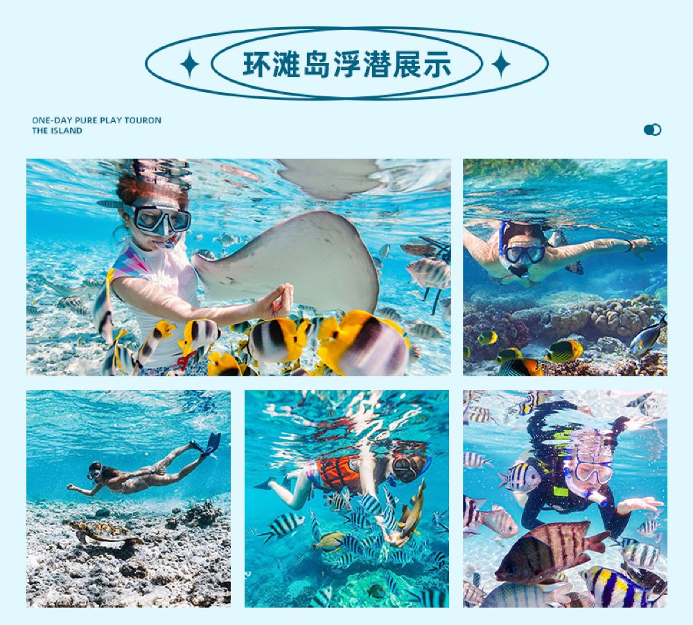 环滩岛一日游简介:早上7:20-7:50市区酒店接送;8:30左右码头出发前往环滩岛,包含岛上午餐和浮潜项目;约15:30左右回到码头。