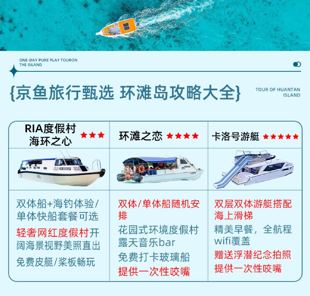 套餐包含环滩之恋(含网红五号船)和RIA 两个基地;可升级深潜和加红树林。