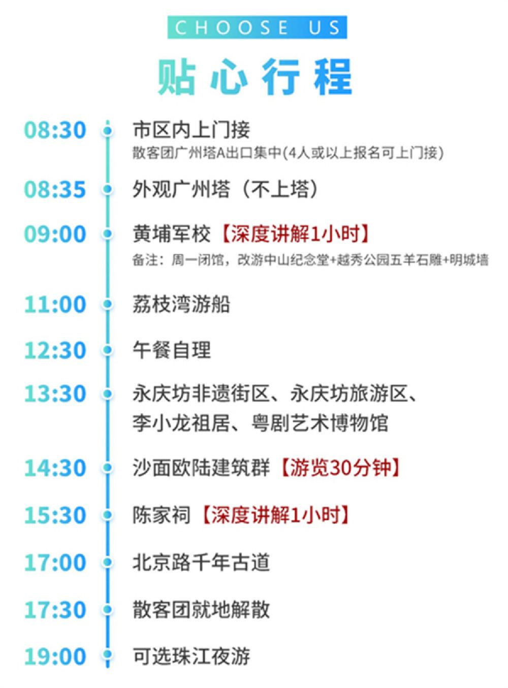 1、景点:【黄埔军校旧址纪念馆】每周一闭馆,改游【中山纪念堂】;【陈家祠】适周二闭馆则退门票费用,改为外观。