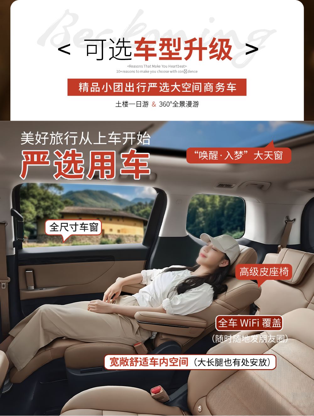 2、本产品按实际人数安排合适车型,并根据先到先上车原则,不预留位置,不接受指定座位,在不影响您行程的情况下,可能会南靖土楼和永定土楼共用车辆,交通过程中需要更换车辆,敬请谅解~