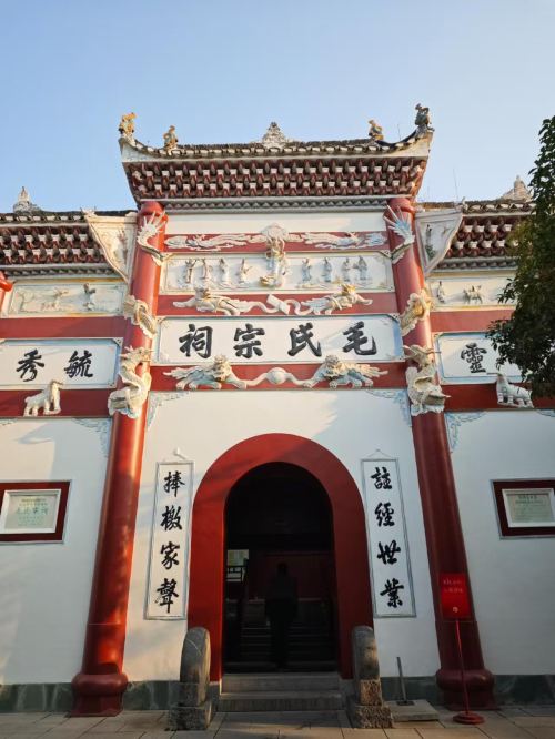 ▲ 韶山毛氏宗祠位于湖南省韶山市韶山乡韶山冲十八罗汉山麓,是韶山毛氏家族的总祠堂。始建于清乾隆二十八年(1763 年),为砖木结构,青砖青瓦,建筑面积约 700 平方米。 毛氏宗祠在韶山景区内,坐东南朝西北。宗祠大门门额有 “毛氏宗祠” 四字,两侧对联为 “注经世业,捧檄家声”。大门外两边各立一石鼓。祠堂房屋分为三进,一进为戏楼,二进为中厅,三进为 “敦本堂”。中厅右廊悬钟,左廊悬鼓,是全族办公、讲约、祭祀和摆酒设宴的地方。