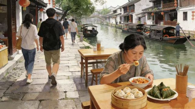 下午2点至5点,在朱家角水乡进行3小时的观光游览。包含美食之旅,品尝两种当地特色小吃:蟹粉小笼包和外婆粽子,随后可自由活动探索古镇。