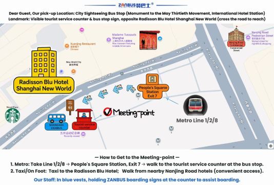 地标:可见旅游服务柜台及公交站牌,位于上海新世界丽笙大酒店对面(过马路即达)
