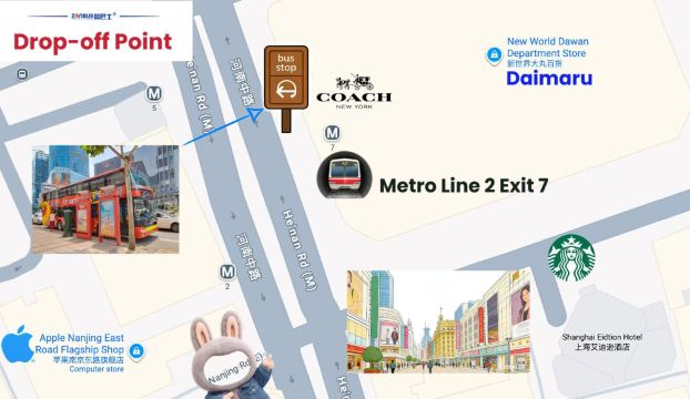 本次游览提供灵活的下车选择。您可以在行程起点——南京路上的大丸百货下车,也可在任意随上随下巴士站点(如外滩或豫园)下车,按自己的节奏继续探索。