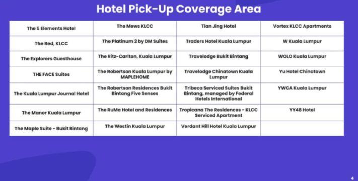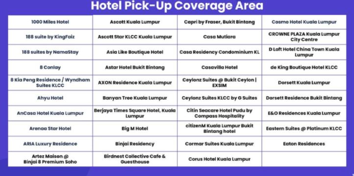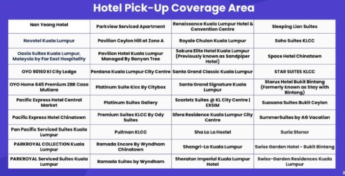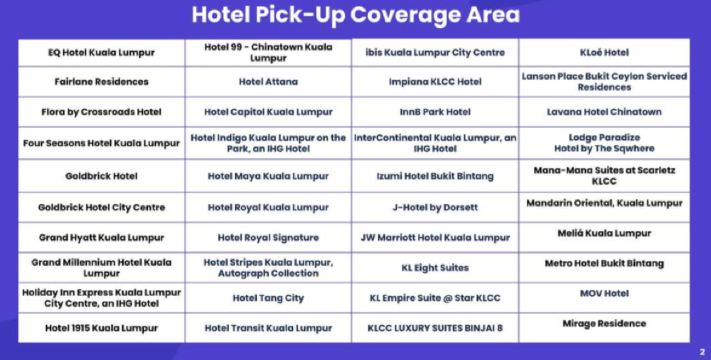 若您的酒店位于吉隆坡市中心和武吉免登区以外(郊区酒店),请选择附近的酒店,或于成功时代广场正门口(星巴克咖啡前)集合