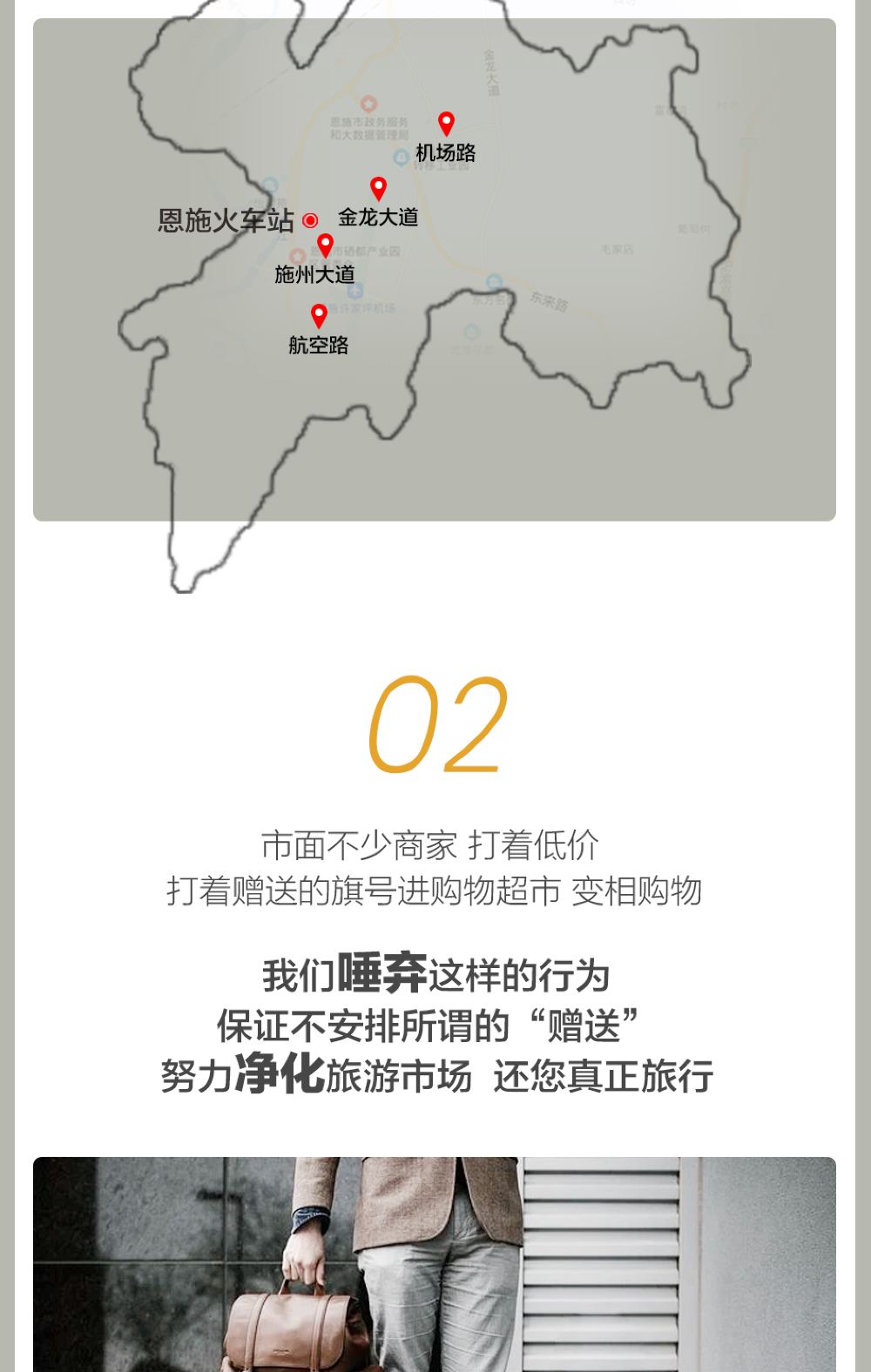 1、因恩施属于山地,旅游车需要加刹车降温水,前往景区的途中有很多农民给大巴车免费提供加刹车降温水,给游客免费提供卫生间、免费加茶水等,同时将自己种植的茶叶或y材销售给客人,沿途农民设的这种场所属于公共购物场所,不属于我社安排的购物店,请谨慎购买。
