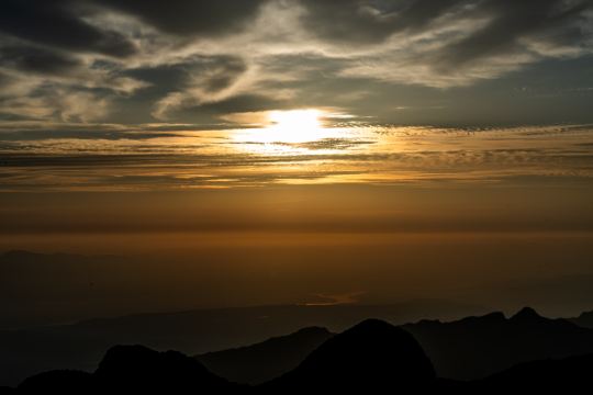 ▲ 太阳从遥远的地平线上缓缓升起,逐渐将山顶和周围的云海沐浴在金色的光芒中。随着太阳升高,云海开始消散,山峦的阴影慢慢褪去,露出岩石与山脊的鲜明轮廓。阳光在山体表面反射,创造出令人惊叹的色彩光谱——从深紫到温暖的橙黄,再到灿烂的金色。天空与大地交织成一幅壮丽的画卷。