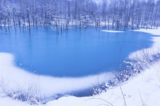 ▲ 【美瑛青池】 冬季的美瑛青池,仿佛进入了一个静谧而纯净的童话世界。池水在严寒中逐渐结冰,原本湛蓝的水面被冰雪覆盖,池中枯立的落叶松被白雪包裹,像一根根静默的雕塑,营造出空灵而梦幻的氛围。