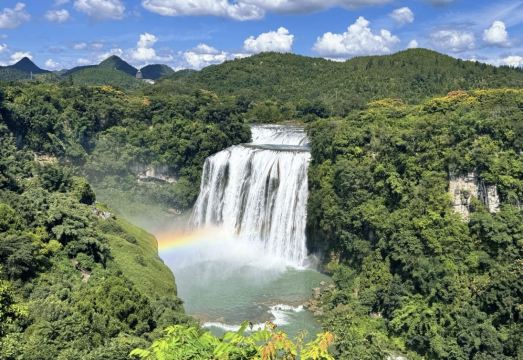 ▲ - 亚洲第一大瀑布,水势磅礴,声震山谷。 - 高77.8米、宽101米,雄奇壮阔,水雾漫天。 - 白水河在此断崖跌落,轰然如雷,银练凌空。 - 丰水期万马奔腾,枯水期轻纱漫舞,四季景不同。 - 阳光折射下常现彩虹,宛若仙境。 - 贵州黄果树,世界著名大瀑布之一。