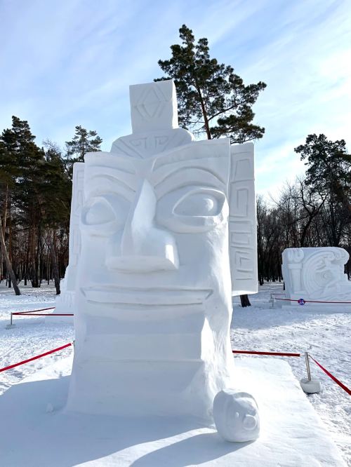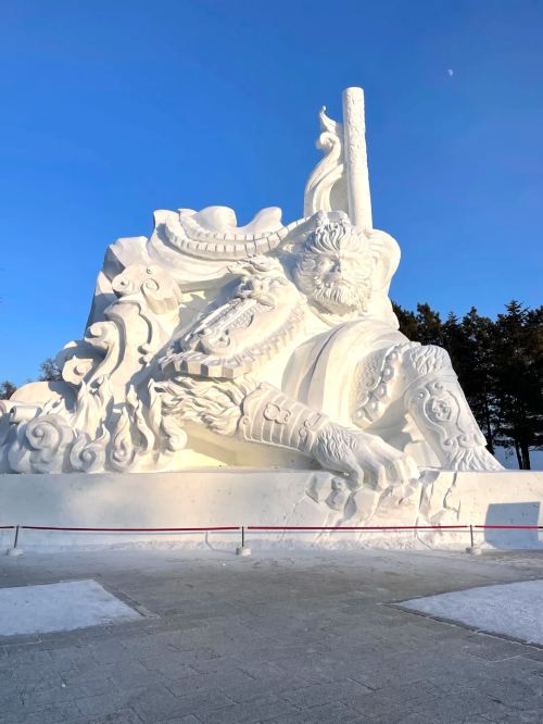 ▲ 这座精细雕刻的雪雕展示了独特的艺术风格,面部表情生动,雕刻细节栩栩如生,仿佛带着一丝神秘的微笑,融入冰雪的世界,展现了雪雕艺术的无穷魅力。