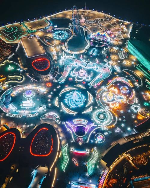 ▲ 从空中俯瞰,灯光璀璨的冰雪大世界仿佛是一颗璀璨的明珠,五光十色的灯饰与冰雕交织成一幅令人震撼的冬日画卷,营造出梦幻般的氛围。