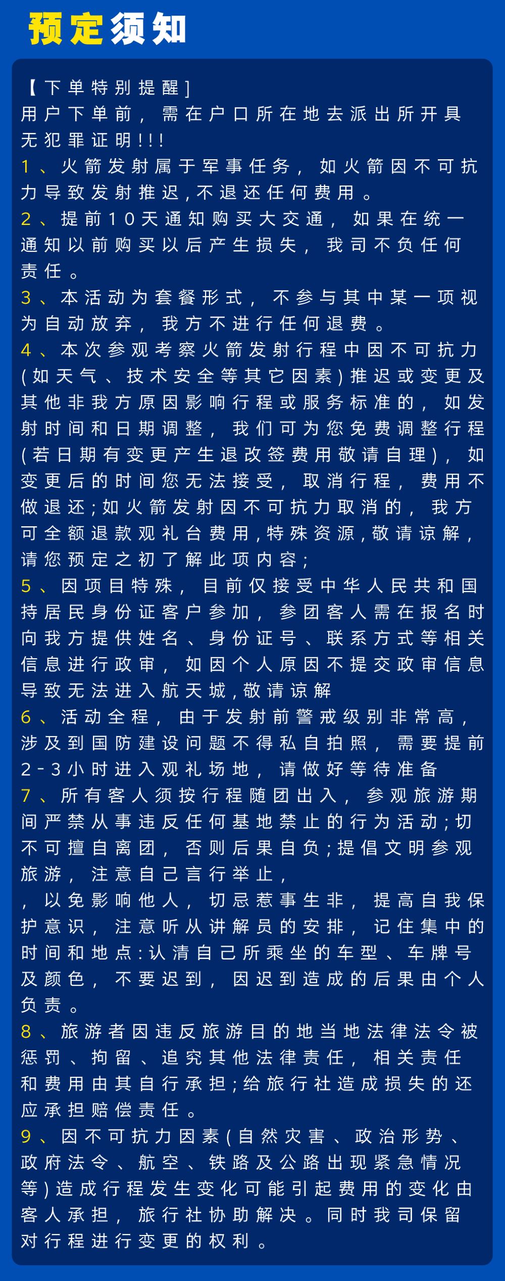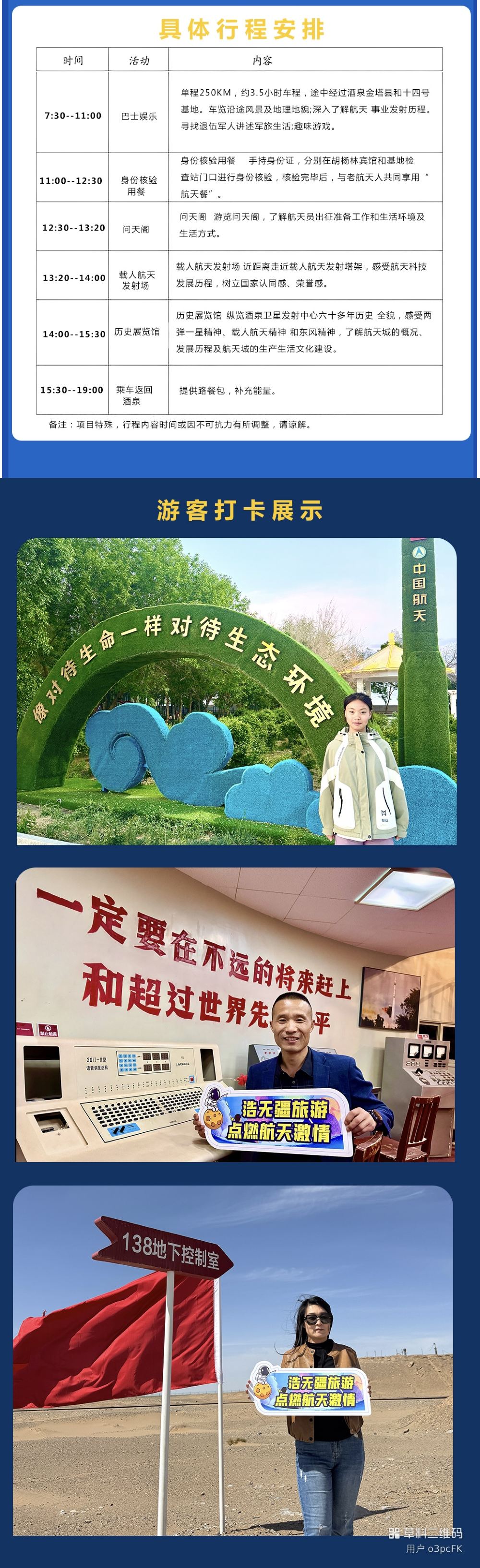 场内(线路):载人航天发射场(外围指定参观区域)、历史展览馆(周一闭馆)、问天阁(如遇重大发射项目或重大事件停止参观)、飞天公园、东风礼堂(外景),具体参观场景根据参观当天基地实际开放情况参观5选3处。