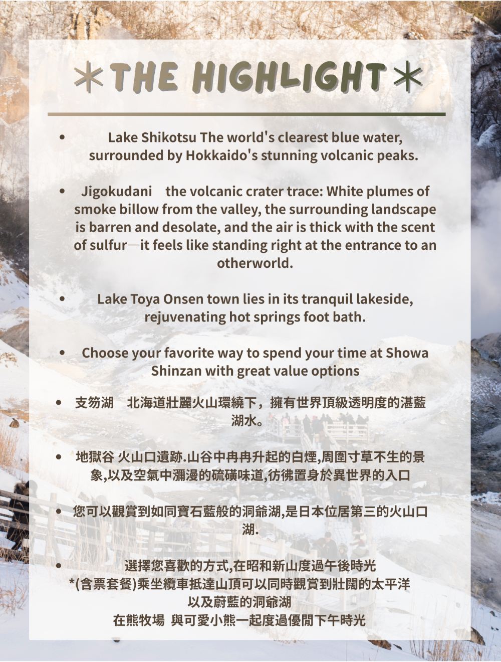 北海道1日游|支笏湖&登别地狱谷,熊牧场,昭和新山,洞爷湖【探访北海道鬼斧神工的自然景观,眺望洞爷湖美景、寻找登别地狱恶鬼踪迹】