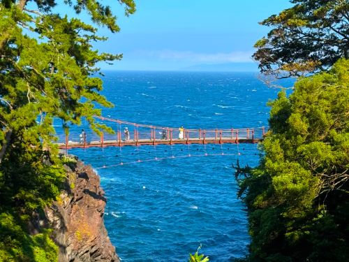 ▲ 【门胁吊桥】 是日本伊豆半岛的标志性景点,一座悬在太平洋之上的吊桥,全长约48米,桥面距离海面约23米。站在桥上,脚下是碧蓝的海水和火山岩,非常有"行走在天海之间"的感觉。
