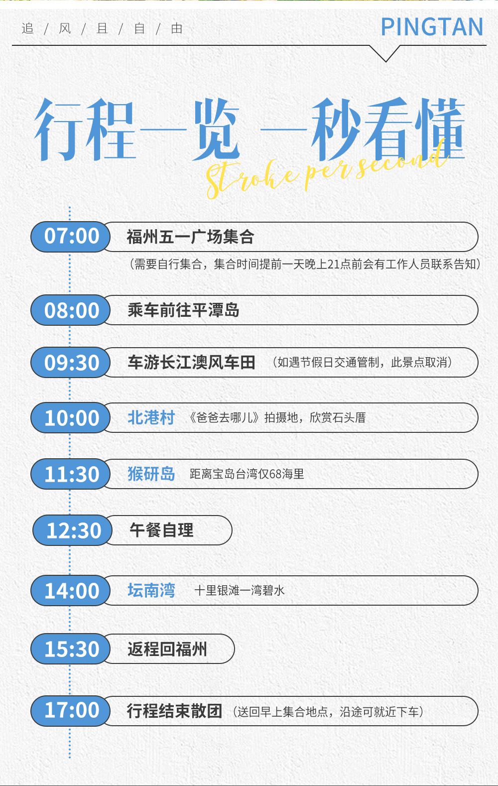 【行程安排】五一广场集合——平潭岛——车游长江澳风车田——北港村——猴研岛(68海里景区)——坛南湾——返程福州