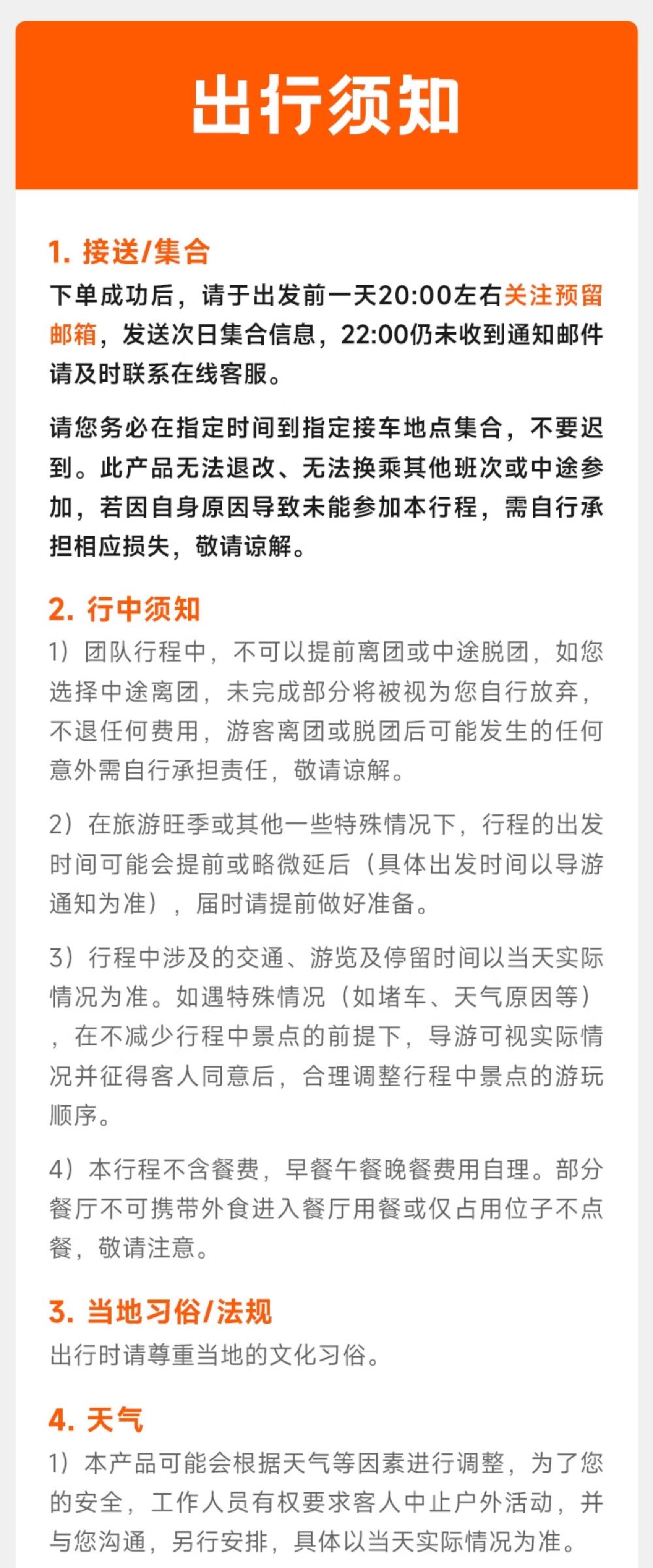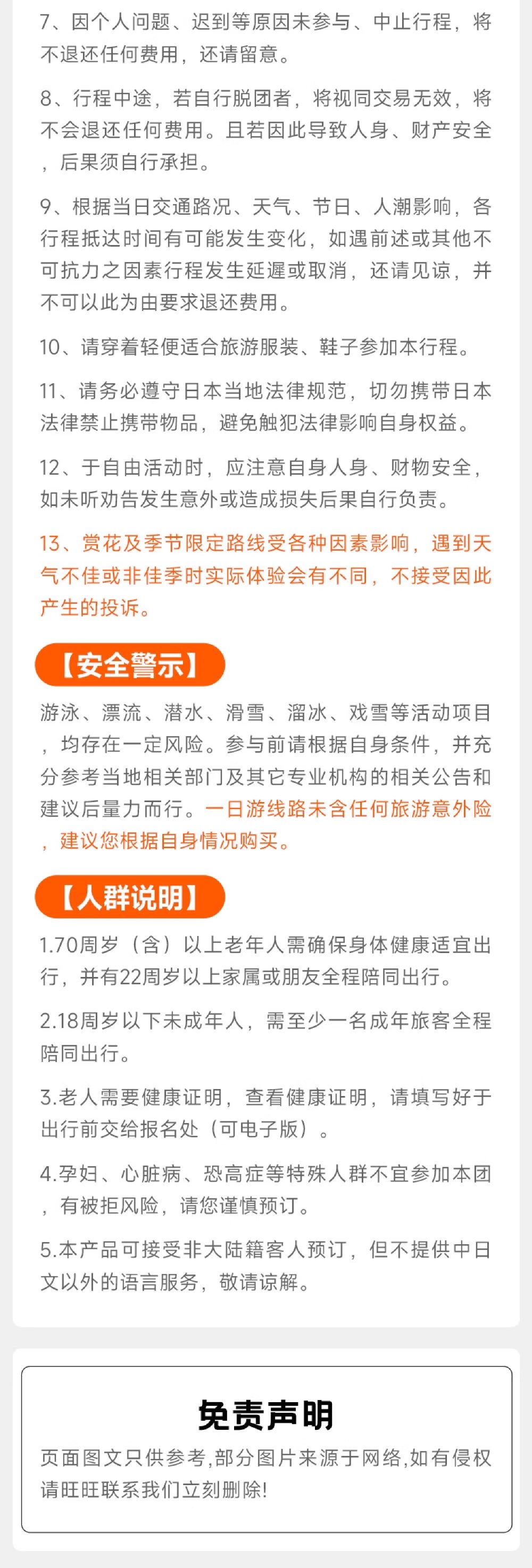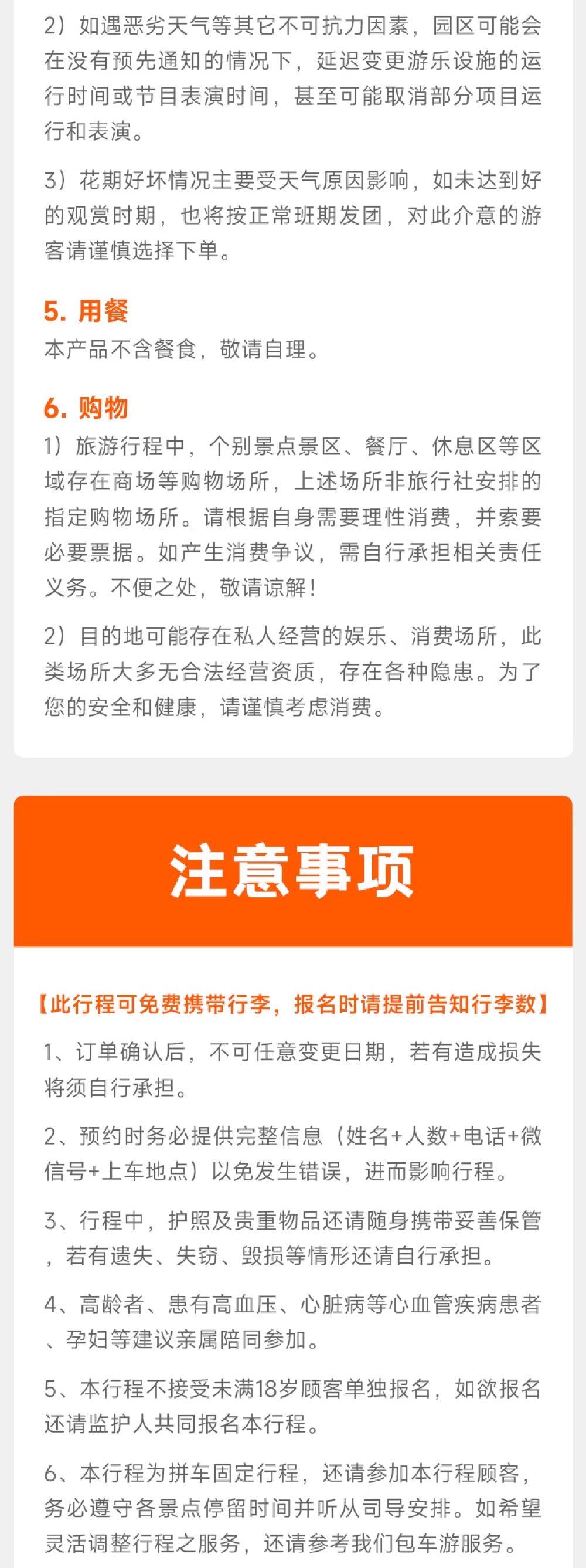 ▲ 【人群说明】 1.65周岁(含)以下老年人需确保身体健康适宜出行,并有22周岁以上家属或朋友全程陪同出行。 2.18周岁以下未成年人,需至少一名成年旅客全程陪同出行。 3.老人需要健康证明,查看健康证明,请填写好于出行前交给报名处(可电子版)。 4.孕妇、心脏病、恐高症等特殊人群不允许参加本团。 5.本产品可接受非大陆籍客人预订,但不提供中英文以外的语言服务,敬请谅解。