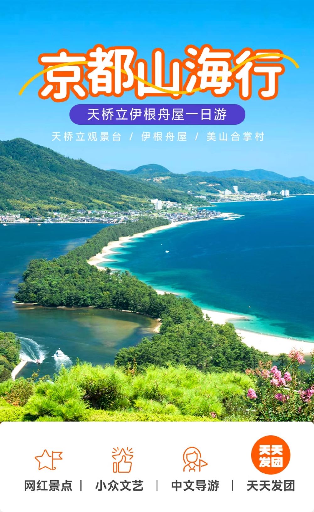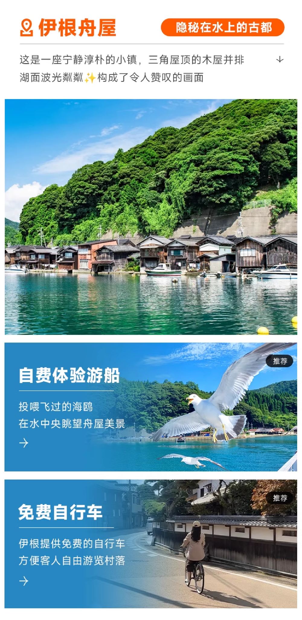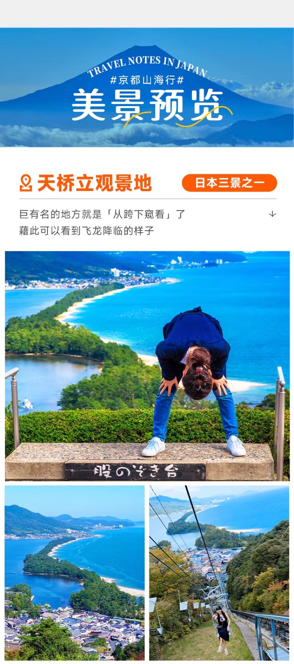 ▲ 伊根舟屋:一个被誉为日本“威尼斯”的小渔村,沿海而建的舟屋错落有致,仿佛漂浮在海面上,独特的水上生活方式,形成了与世隔绝的治愈感。这里没有熙熙攘攘的游客,只有海风、渔船、和温暖的人情味,仿佛走进了一部宫崎骏的电影。 天桥立:日本三景之一,在长约3.6公里的沙滩上,有着8,000多棵松树形成的林荫,坐缆车抵达山上后,会看到人们弯下腰从跨下倒着看前方的天桥立沙洲。 美山茅草屋:日本三大茅草屋集落之一,260年历史的合掌造村落,随手拍都是《龙猫》场景,在这里,可以欣赏到传统的建筑风格