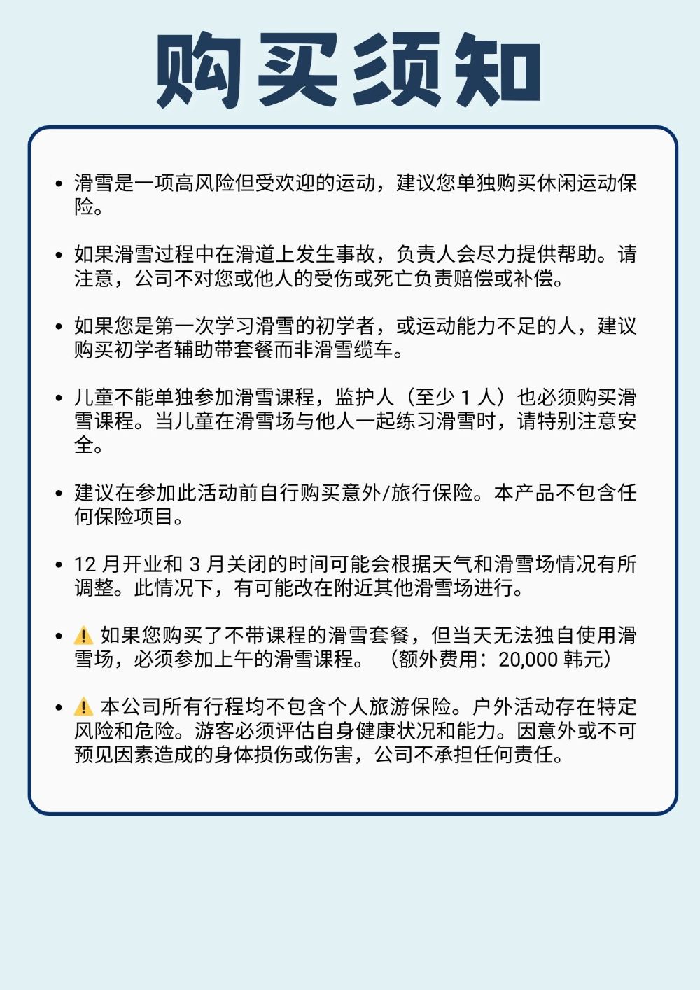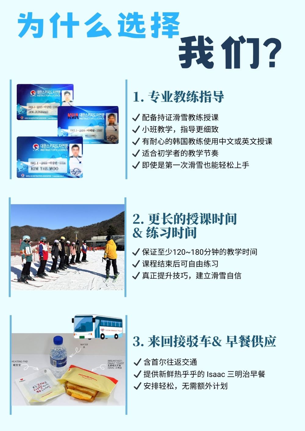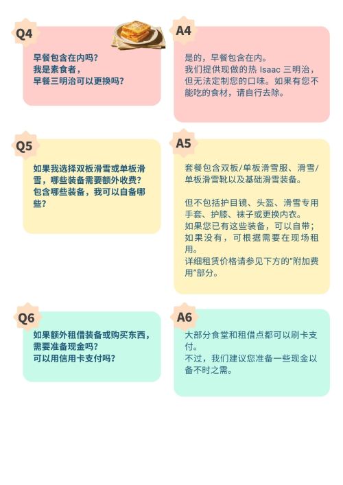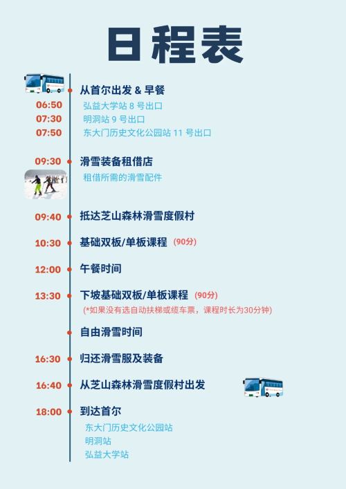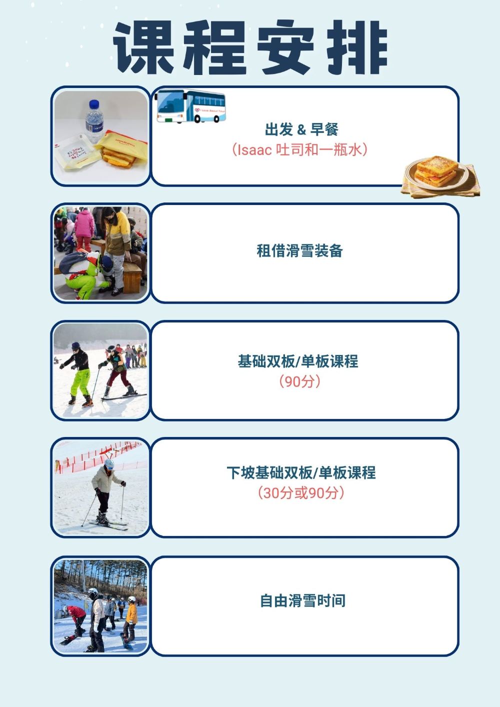 专业滑雪教练带领教学,中文领队全程陪同,纯学纯练,无购物,初学者也能迅速掌握滑雪要领 ,还有与众不同的早餐特别服务哦!