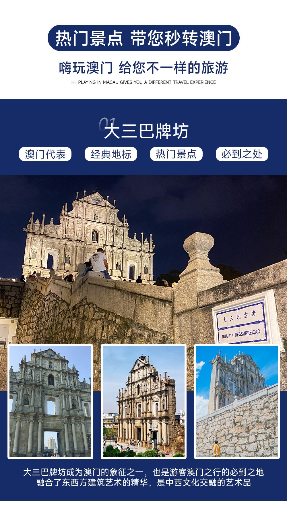 【大三巴】(游览时间约30分钟)过关后由导游接待乘车前往大三巴牌坊,是澳门标志之一,也是澳门八景之一的“三巴圣迹”,大三巴牌坊的雕刻和镶嵌较为精细,融合了东西方建筑艺术的精华,是一个中西文化交融的艺术品。
