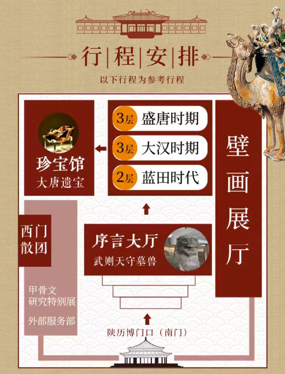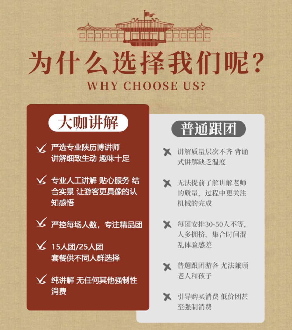 “咸阳说”常规精品团(封顶25人团,含陕历博代预约):官方持证导游专业带队,3小时深度精讲,每团仅限25人,营造舒适聆听环境。相比暑期市场常见的40人以上大团+2.5小时匆忙讲解,我们更注重知识吸收与游览体验,尤其适合历史初学者,轻松入门、高效打卡。——打卡速通版·小白友好