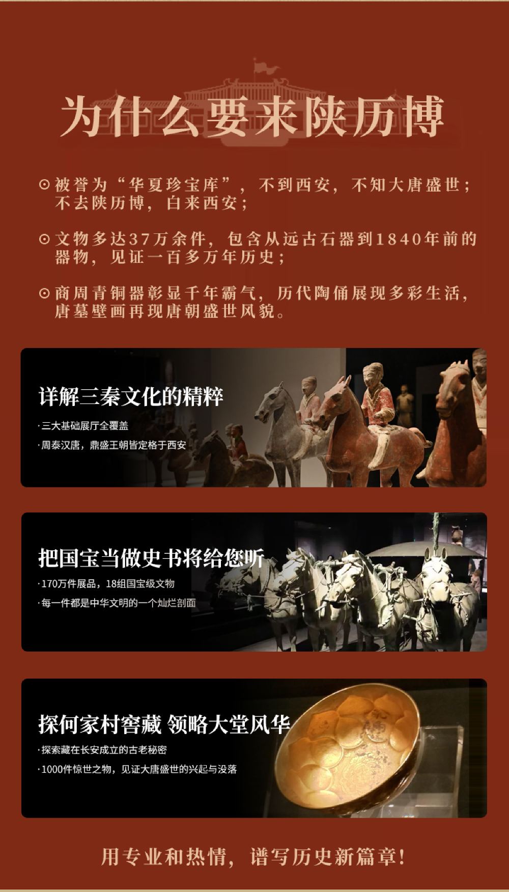 “咸阳说”文史大咖团(封顶15人团,含陕历博代预约):由资深文史专家领队,开展3小时互动式讲解,深度解读陕西历史博物馆镇馆之宝,细致剖析古都文物背后的文化脉络。强调知识性与体验感,特别适合亲子家庭及研学群体,是一趟有温度的历史进阶课。——文史进阶版·亲子研学优选