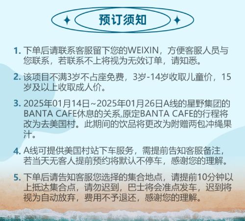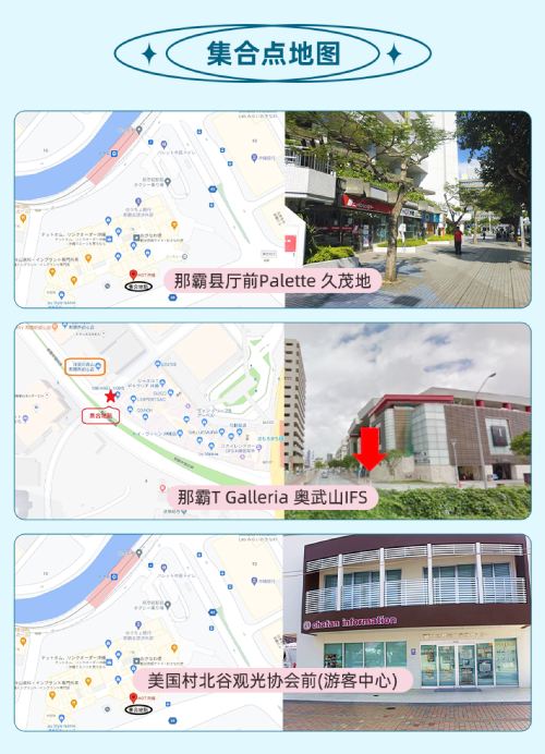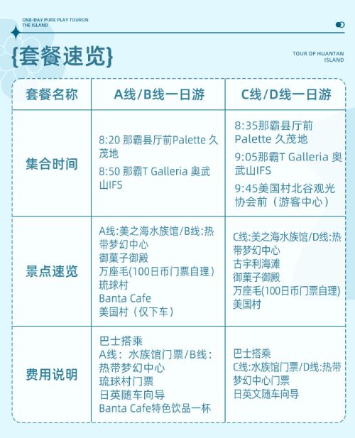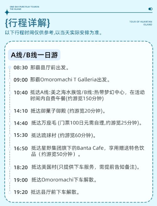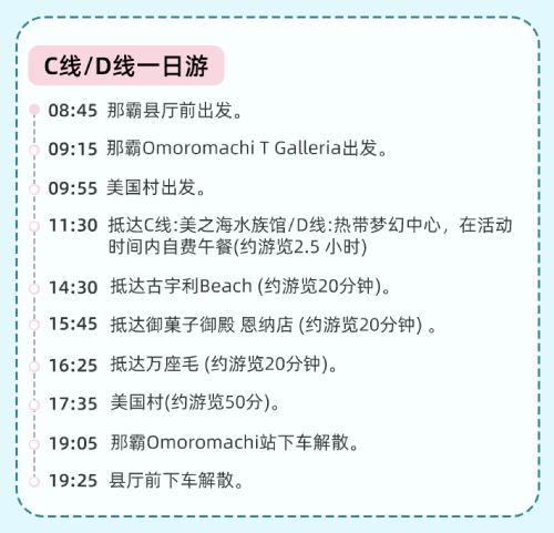 冲绳北部观光巴士分为A线和C线,具体详细行程见图片内容详情,集合点为县前厅。