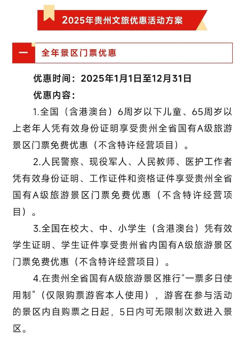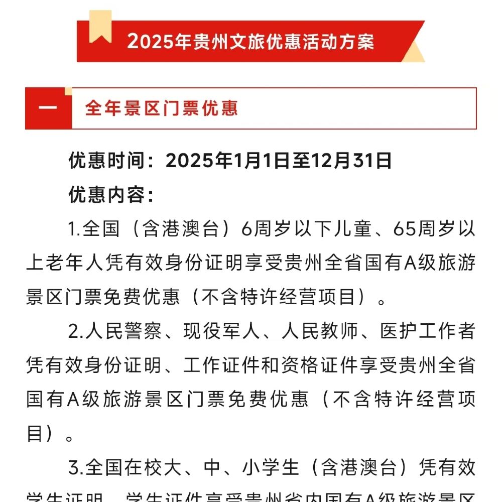 2025免票优惠活动,凭有效证件可享受贵州全省国有A级景区免门票优惠(不含特许经营项目)。