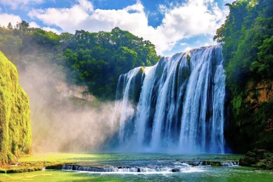▲ 银河坠地,壮美天成 黄果树瀑布如一条银河从九天倾泻而下,白练悬空,飞珠溅玉,声震山谷。水势奔腾如雷霆,激起漫天雪雾,阳光穿透时幻化出七彩霓虹,宛如天女散花,美得惊心动魄。这不仅是水的倾泻,更是大自然的磅礴诗篇,令人站于瀑前,心随水动,魂随雾升。