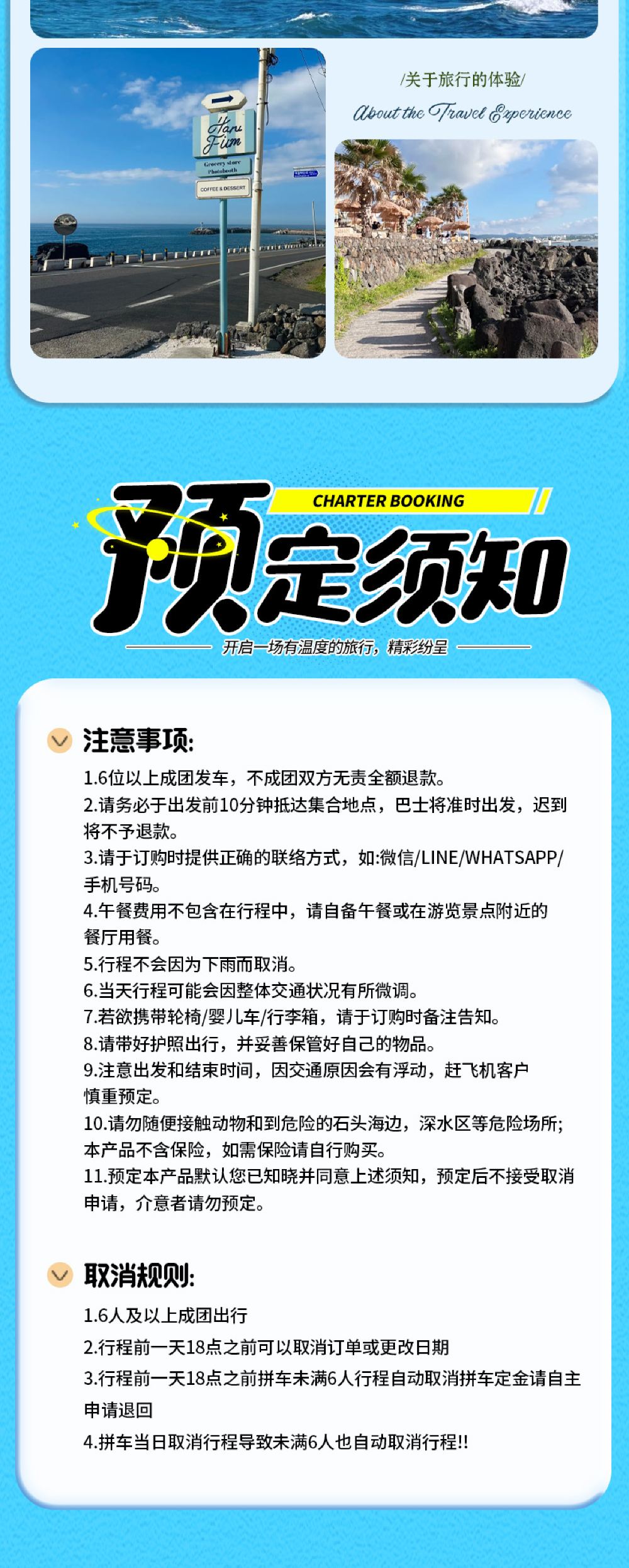 特别注明:6人起团,行程前一天18点之前可以取消订单或更改日期,行程前一天18点之前拼车未满6人行程自动取消,拼车当日早上有取消行程的小伙伴导致一车未满6人,行程自动取消(取消人员定钱不退,其他小伙伴请自助申请退款)。