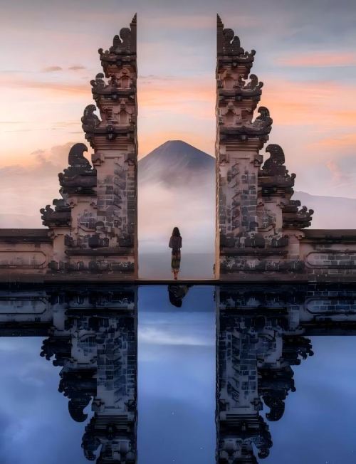 天空之门位于巴厘岛东部山区的历史悠久的印度教寺庙——Lempuyang Temple,这是一座庙宇群,天空之门是这所有的庙宇之中海拔低的一座,也是容易抵达的地方。它坐落在海拔1175米的Lempuyang山上,是巴厘岛上重要的九个方向寺庙之一。天空之门占据着得天独厚的优势位置,直面阿贡火山,似乎穿过这扇门就可以抵达另一个世界。在晴朗的天气里,透过天空之门可以直接看到阿贡火山和大海,云雾缭绕时,天空之门和寺庙则如同空中建筑,似仙境一般。