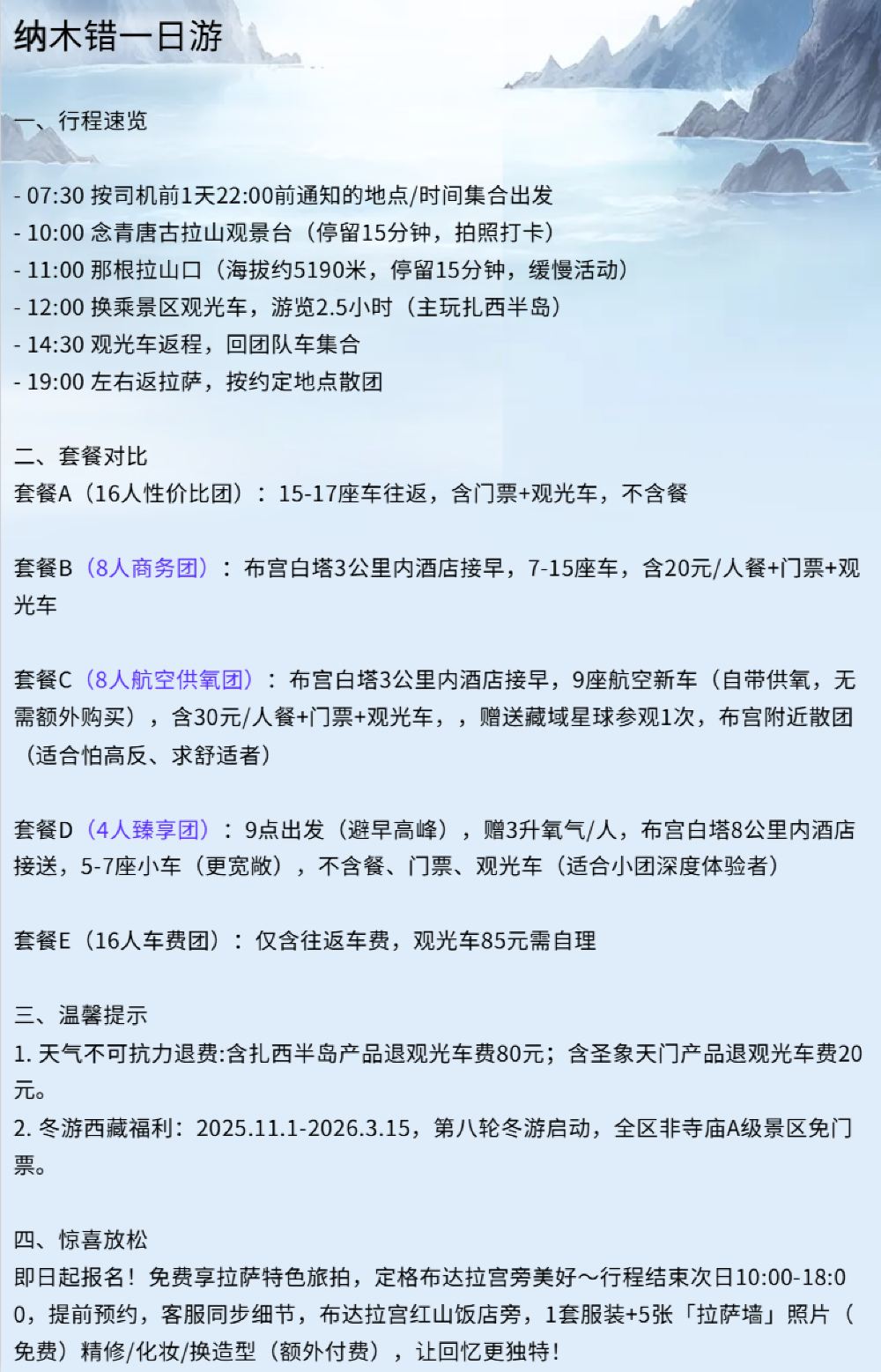 西藏纳木措扎西半岛一日游 多套餐可选 满足多样需求 惬意随行【纳木措(三大圣湖)官方直通车!6大套餐明分:6个扎西半岛,正规踏实!】