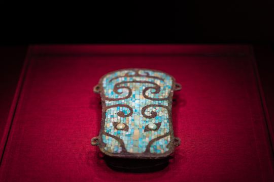 ▲ 绿松石镶嵌牌饰,以青铜为胎,表面满嵌绿松石,构成兽面纹图案,纹饰精致、色彩夺目。它是夏代玉器工艺与镶嵌的杰出作品,不仅是精美饰品,更承载着夏代的宗教信仰与等级秩序,是解读 “最早的中国” 礼制文明的关键物证。