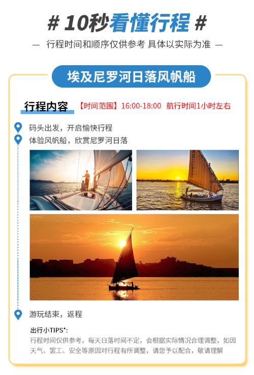 埃及风帆船三角帆船看日落/酒店接送丨开罗/阿斯旺/卢克索可选【[尼罗河]是非洲大陆较长的河流,也是孕育古埃及文明的摇篮他被称为埃及的“母亲河”“生命之河”】